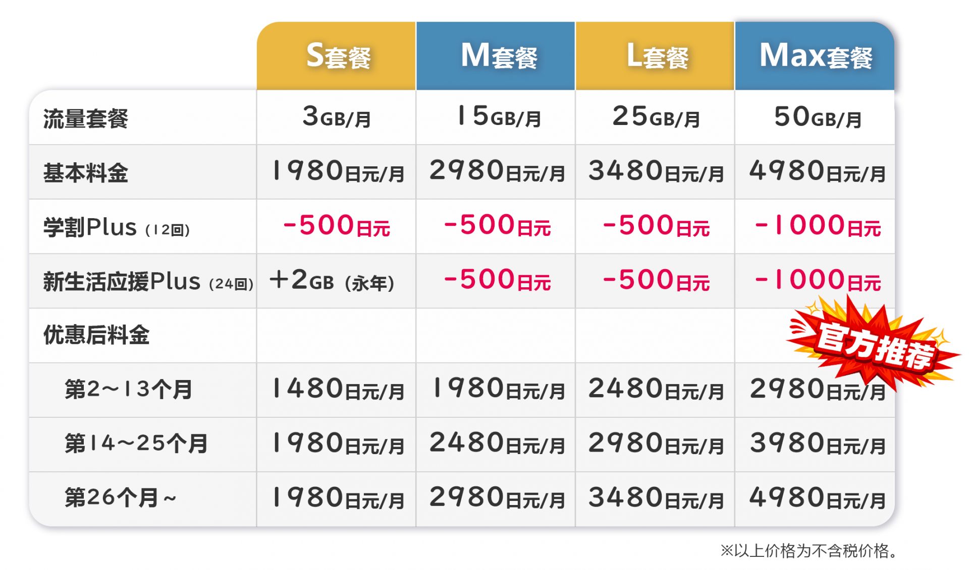 【非表示】 有四种套餐选择 【非表示】 S套餐 3GB 1,980日元 / 月 (2,178日元含税/月) M套餐 15GB 2,980日元 / 月 (3,278日元含税/月) L套餐 25GB 3,480日元 / 月 (3,828日元含税/月) MAX套餐 50GB 4,980日元 / 月 (5,478日元含税/月) 【非表示】 【非表示】 5分钟内无限通话 500日元 / 月 (550日元含税/月) 10分钟内无限通话 700日元 / 月 (770日元含税/月) 无限通话 1,500日元 / 月 (1,650日元含税/月) ※拨出的每通电话,超过5分钟的部分将按照 22日元/ 30秒(含税)的价格另外计费。 ※超过5分钟/10分钟的部分将按照 22日元/ 30秒(含税)的价格另外计费。 ※(0570)(0180)等服务号码,(188)特殊号码,(104)的查号台,卫星电话/卫星船舶电话等通话不在免费定额服务范围之内。 当您在生活中遇到日语沟通问题时,可通过此服务获取翻译帮助。 ※翻译服务对应时间:10:00 – 18:30服务专线:03-4400-1066